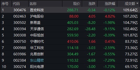 个股方面,胜宏科技成交额超109亿元居首,沪电股份、新易盛、天孚通信成交额靠前。