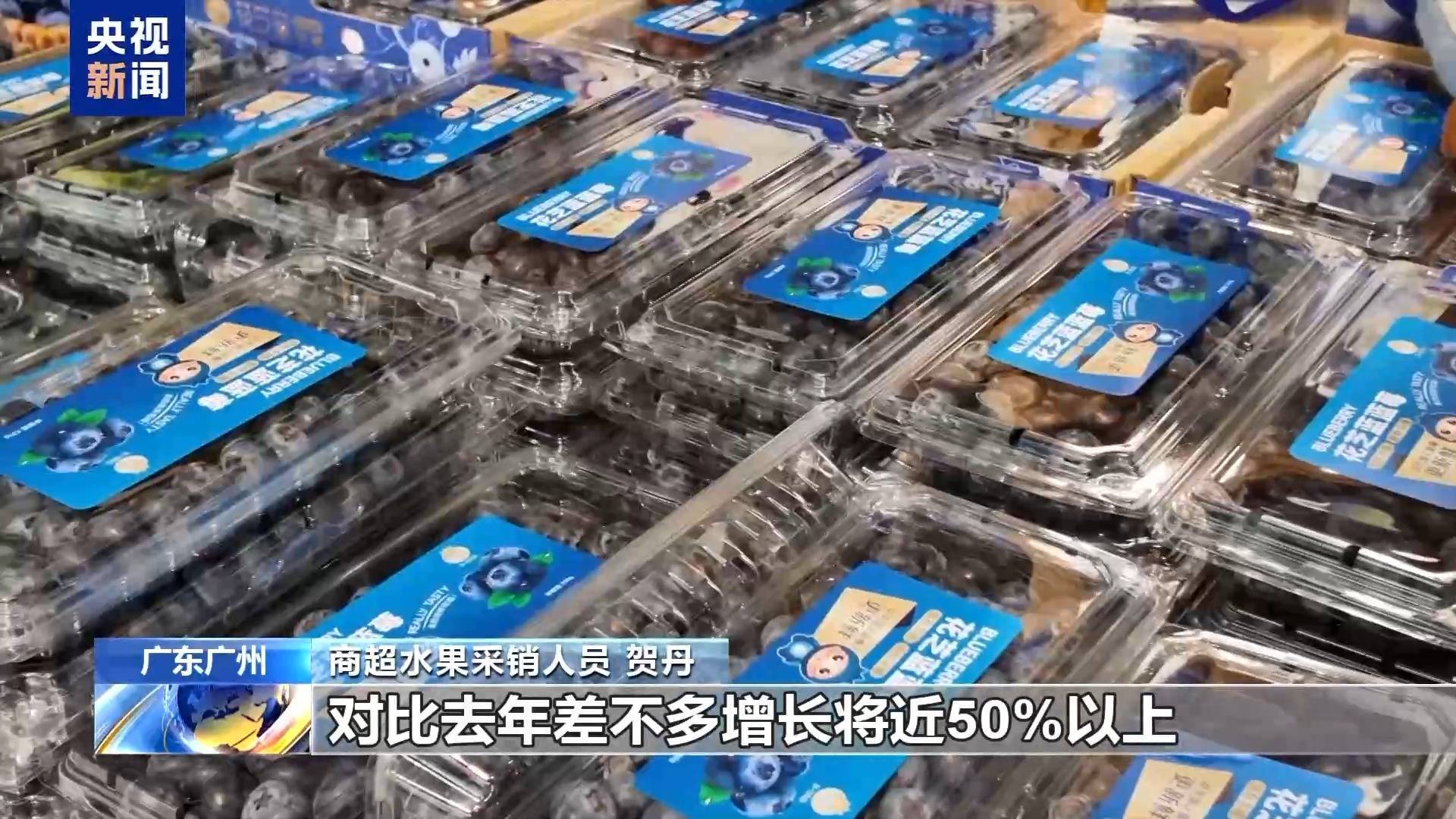 商超水果采销人员 贺丹:这款蓝莓是目前顾客复购最高的一款,因为是广州本地的,从基地到门店销售,最快只要12个小时,新鲜度非常好。从目前的趋势来看,我们今年蓝莓销量对比去年增长50%以上。