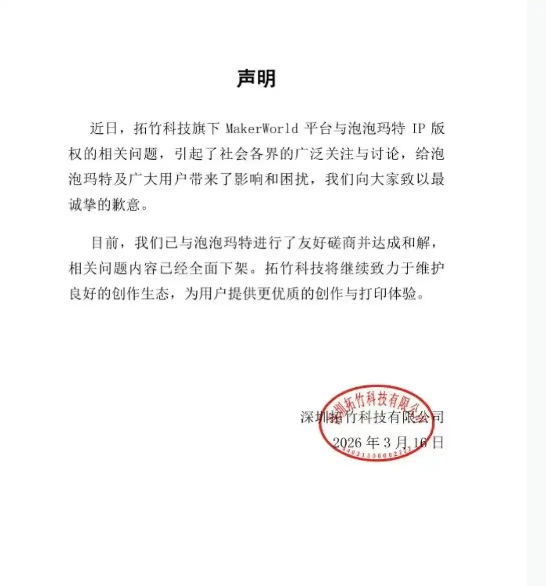 3月16日,消费级3D打印头部企业拓竹科技(Bambu Lab)与潮玩巨头泡泡玛特(Pop Mart)联合宣布,双方就旗下MakerWorld平台涉及泡泡玛特IP版权的相关问题已进行友好磋商并达成和解。